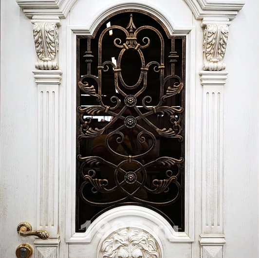 Дверь с массивом, ковкой и стеклом, резьбой, карнизом