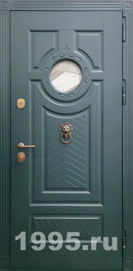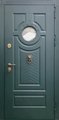 Стальная дверь с круглым стеклом, кнокером и зелеными панелями МДФ RAL (терморазрыв) Арт: 894