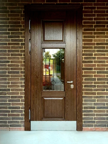 Дверь с массивом, ковкой и стеклом, резьбой, карнизом
